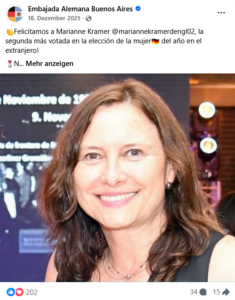 Sie lebt in der argentinischen Hauptstadt Buenos Aires und wurde dort auch als Tochter deutschstämmiger Eltern geboren. Ihre Mutter ist eine Donauschwäbin, die nach dem Zweiten Weltkrieg aus dem Banat im heutigen Rumänien nach Argentinien kam. Die Vorfahren ihres Vaters wanderten 1921 aus Westfalen ein. Zu Hause wurde und wird bei Marianne nur Deutsch gesprochen. Nach ihrem Marketingstudium fing sie damit an, deutsche Institutionen in ihrer Umgebung bei deren Werbe- und Kulturaktivitäten zu unterstützen. Dazu gehörten und gehören die deutsche Schule, die sie als Kind besuchte, der Club Alemán in einem Wolkenkratzer über den Dächern von Buenos Aires, ein deutsches Kinderheim, die deutschsprachige katholische Gemeinde und das Zentrum zur Dokumentation der deutschen Einwanderung (DIHA). Aber damit noch nicht genug: Marianne tanzte in der Volkstanzgruppe „Freundeskreis“ und engagierte sich im örtlichen Verein der Donauschwaben. Aktuell singt sie im Chor vom Club Alemán und beteiligt sich an der Organisation des landesweiten Jugendwettbewerbs „Kulturfest“, der die deutsche Kultur und Sprache im zweitgrößten Land Südamerikas fördern soll. Noch ist in Argentinien die Kultur der schätzungsweise über zwei Millionen Deutschstämmigen lebendig. Das ist Argentiniendeutschen wie Marianne zu verdanken, die sich in den zahlreichen deutschen Schulen und Vereinen engagieren.