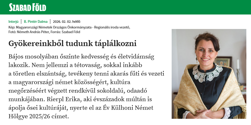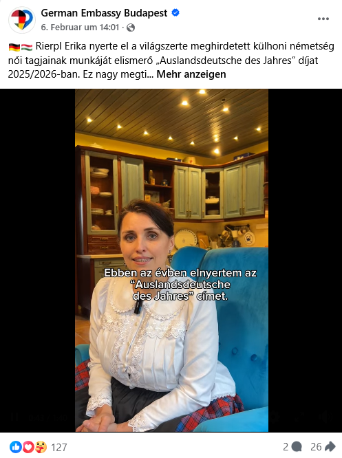 Die Ungarndeutsche Erika ist für den Titel „Auslandsdeutsche des Jahres 2025″ besonders geeignet, da sie einerseits nach Jahrhunderten noch immer die Kultur ihrer Vorfahren pflegt und andererseits zwei außergewöhnliche Eigenschaften aufweist: Beide Elternteile haben deutsche Wurzeln und sie trägt nicht nur einen deutschen Nachnamen, sondern sogar noch einen deutschen Vornamen.“