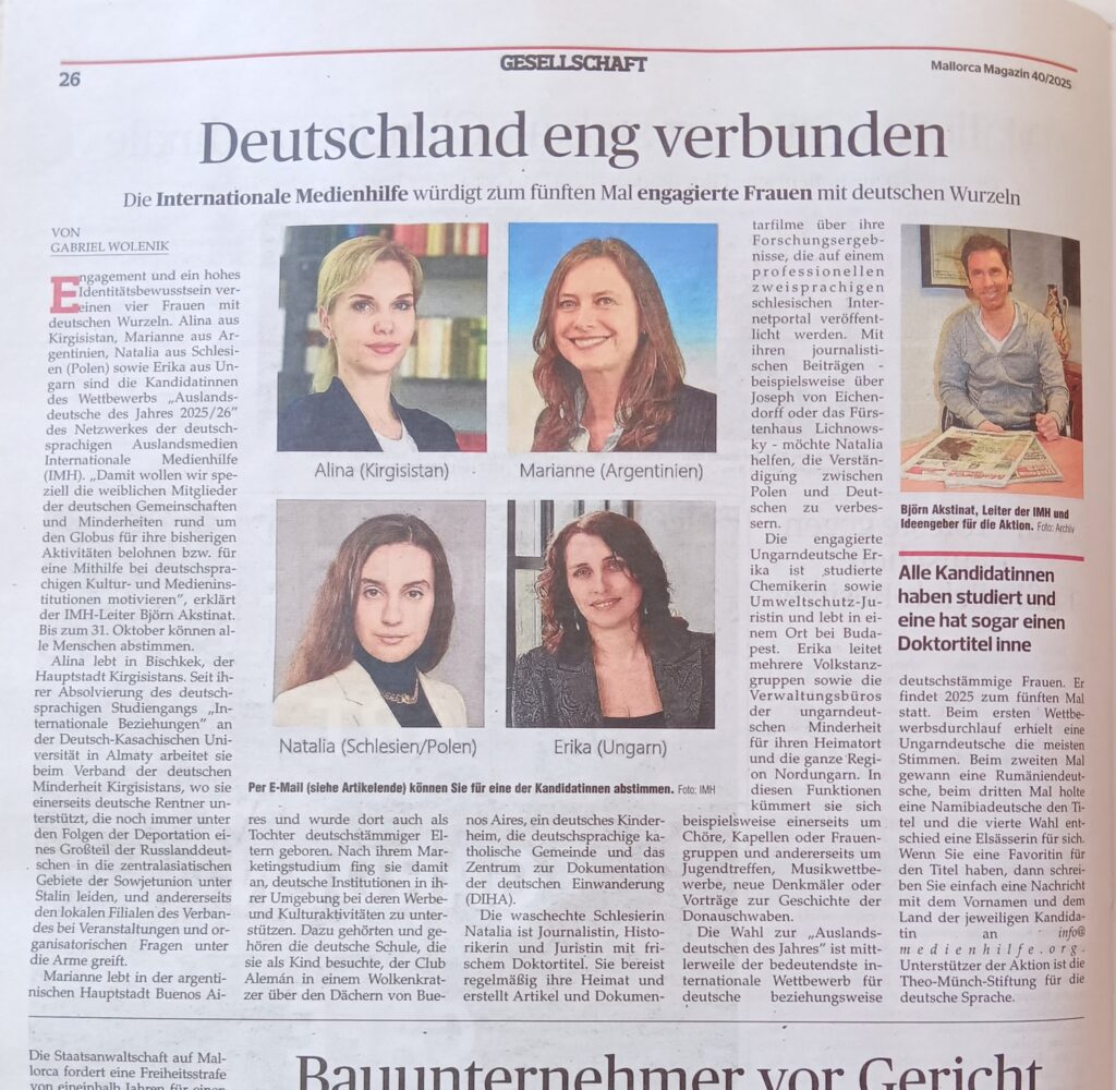 Die Wahl zur „Auslandsdeutschen des Jahres“ findet 2025 zum fünften Mal statt. Mittlerweile hat sie sich zum bedeutendsten Wettbewerb für Auslandsdeutsche sowie für deutsche Frauen weltweit entwickelt. Dabei geht es nicht in erster Linie um Schönheit, sondern vor allem um das Engagement für die eigene Kultur. Veranstalter ist die Internationale Medienhilfe (IMH), der Verband der deutschsprachigen Medien in aller Welt.