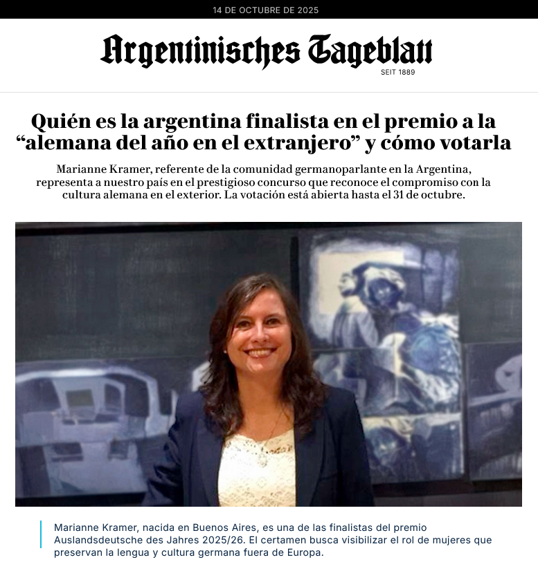 Sie lebt in der argentinischen Hauptstadt Buenos Aires und wurde dort auch als Tochter deutschstämmiger Eltern geboren. Ihre Mutter ist eine Donauschwäbin, die nach dem Zweiten Weltkrieg aus dem Banat im heutigen Rumänien nach Argentinien kam. Die Vorfahren ihres Vaters stammen aus Westfalen. Zu Hause wurde und wird bei Marianne nur Deutsch gesprochen. Nach ihrem Marketingstudium fing sie damit an, deutsche Institutionen in ihrer Umgebung bei deren Werbe- und Kulturaktivitäten zu unterstützen. Dazu gehörten und gehören die deutsche Schule, die sie als Kind besuchte, der Club Alemán in einem Wolkenkratzer über den Dächern von Buenos Aires, ein deutsches Kinderheim, die deutschsprachige katholische Gemeinde und das Zentrum zur Dokumentation der deutschen Einwanderung (DIHA). Aber damit noch nicht genug: Marianne tanzte in der Volkstanzgruppe „Freundeskreis“ und engagierte sich im örtlichen Verein der Donauschwaben. Aktuell singt sie im Chor vom Club Alemán und beteiligt sich an der Organisation des landesweiten Jugendwettbewerbs „Kulturfest“, der die deutsche Kultur und Sprache im zweitgrößten Land Südamerikas fördern soll. Noch ist in Argentinien die Kultur der schätzungsweise über zwei Millionen Deutschstämmigen lebendig. Das ist Argentiniendeutschen wie Marianne zu verdanken, die sich in den zahlreichen deutschen Schulen und Vereinen engagieren.